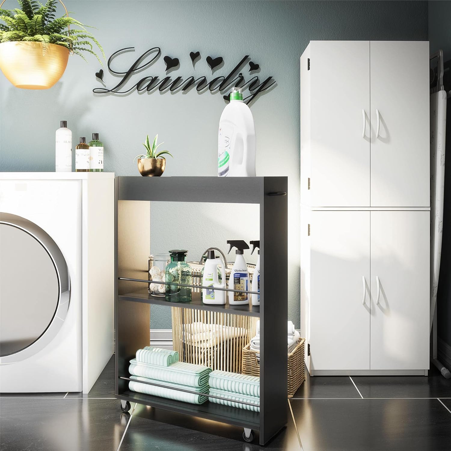 Get compact storage wherever you need it with the Ameriwood Home Trestle Laundry Cart. Made of laminated particleboard, the clean white finish will easily match your existing décor. The 2 lower shelves feature durable metal rods to keep all your essentials in place. Organize detergent, fabric softener, and dryer sheets and then tuck away when not in use. The casters make it easy to place the cart wherever you need. The compact design is perfect for storing the cart next to your washer or dryer to save space. The top shelf is ideal for laundry essentials like stain fighters and scrubbing brushes. This multi-use cart can also be used for a convenient spice rack that can be stored next to your refrigerator or an office cart to store away extra office supplies. The storage possibilities are endless! The Laundry Cart ships flat to your door and requires assembly upon opening. Two adults are recommended to assemble. Once assembled, the Laundry Cart measures to be 35.3”H x 25.9”W x 7.7”D.