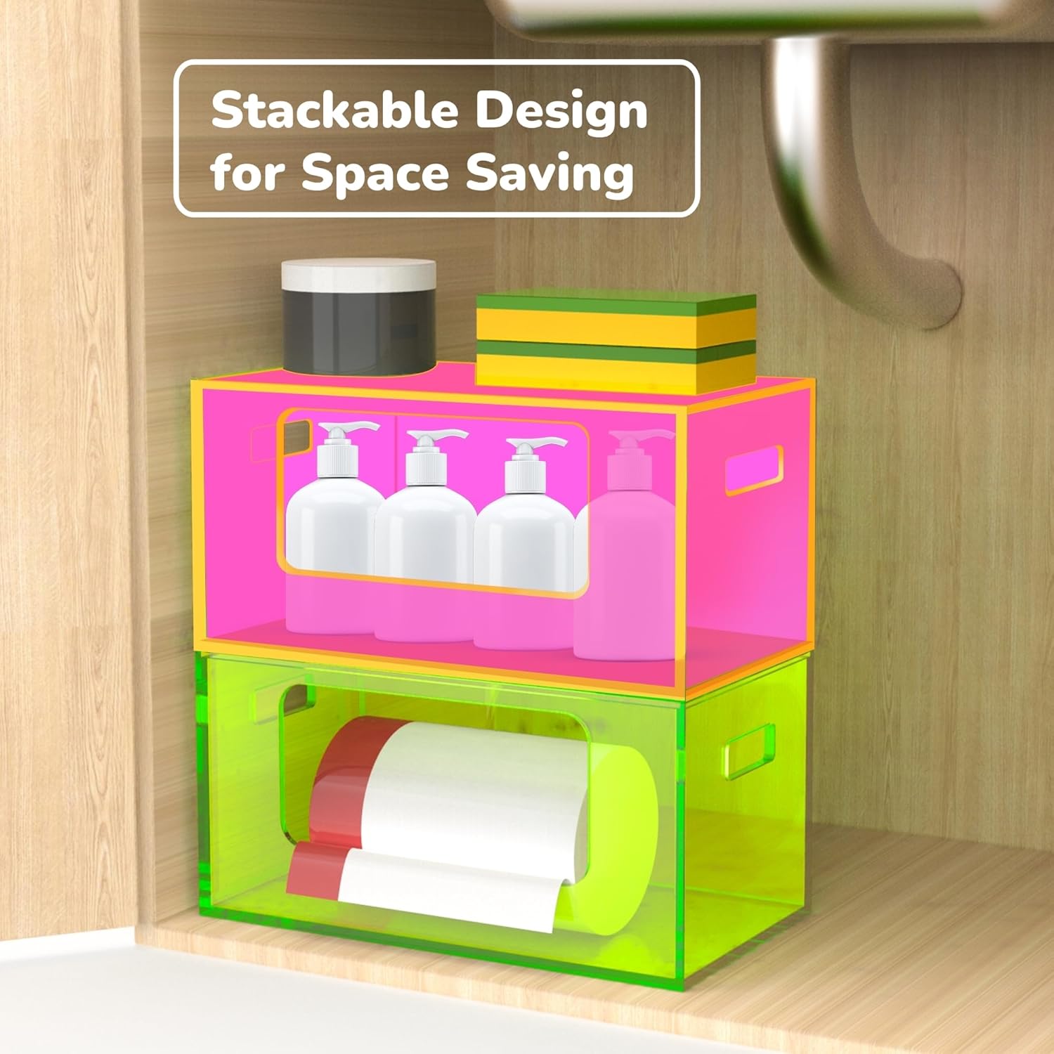 Keep your space organized and your trash bags easily accessible with this stackable trash bag holder dispenser. Designed for maximum convenience, this extra large acrylic garbage bag storage organizer is perfect for your kitchen, laundry room, pantry, or cabinet. Measuring 11.4 x 7.5 x 7 inches, it fits neatly under sinks or in small cabinets, making it ideal for compact spaces. Its clever stacking capability means you can store multiple organizers on top of each other, keeping your environment clutter-free while allowing easy access to your trash bags. Crafted from premium acrylic material, this garbage bag holder is both durable and attractive. It offers long-lasting strength and stability, while its colorful design complements any modern kitchen or laundry room. Whether used as a trash bag dispenser under the sink or as an organizer in your pantry, its sleek, minimalist look will enhance the decor of any space. The trash bag holder dispenser comes with handles, making it easy to move and position wherever you need it. Whether you need to access your garbage bags quickly in the kitchen or store them in the pantry, the portable handles allow for effortless portability and access to your trash bag supply. Add a touch of fun and color to your home organization system! This garbage bag organizer is available in a variety of eye-catching neon colors, allowing you to pick the one that suits your style. Whether you are looking to make a bold statement or prefer a more subtle touch, the vibrant colors offer a fun way to enhance your space while staying functional. With its generous size, this trash bag dispenser can hold a large number of garbage bags, reducing the need for constant refills. You can easily store various sizes of trash bags, making it versatile for different needs. Whether for daily kitchen use, heavy-duty cleaning, or other household chores, this organizer ensures you will always have bags on hand.